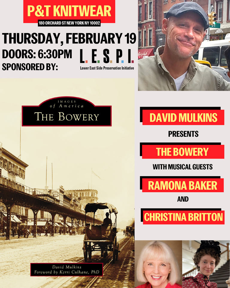 LESPI is proud to sponsor “Images of America: The Bowery” book talk with author David Mulkins, at P&T Knitwear on Thursday, February 19, at 6:30PM.